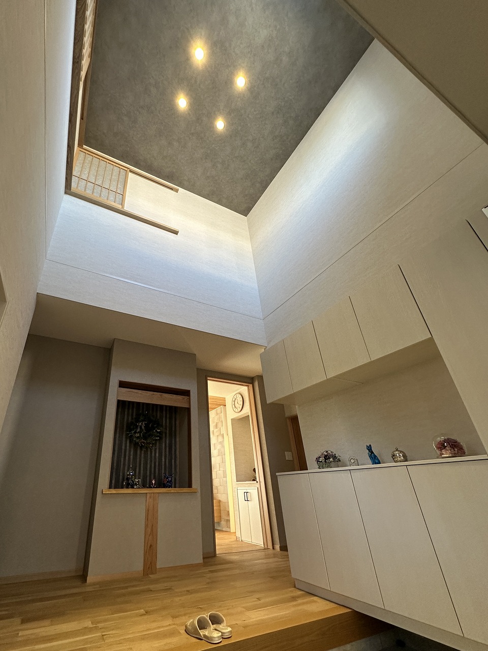奥様: 玄関も吹き抜けのデザインにしてもらいました。おかげで、北向きでもこんなに明るくなるんだ、と驚いています。出かけたり帰ってきたりするたびに気分がいいです。玄関が明るいってすごくいいですね。